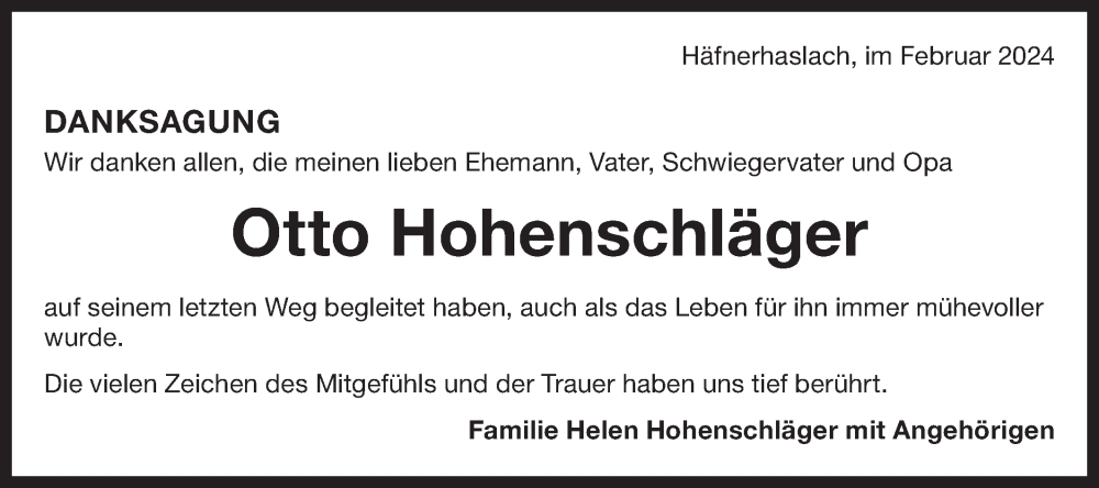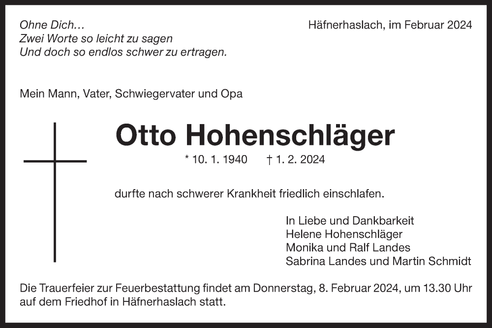 Hier finden Sie alle Traueranzeigen aus der Zeitung, die bisher für Otto Hohenschläger erschienen sind. Weitere Traueranzeigen, die in der Zeitung erscheinen, werden hier ebenfalls aufgelistet