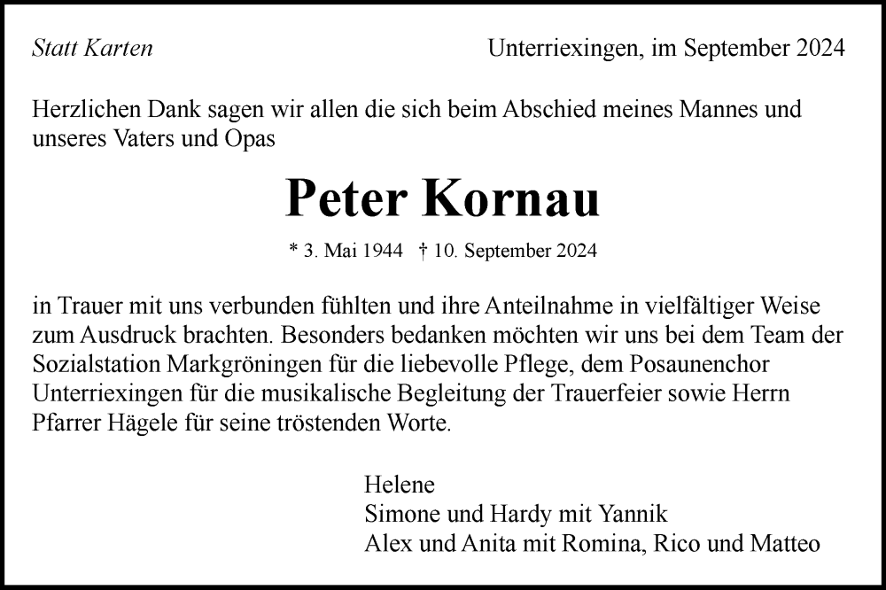 Hier finden Sie alle Traueranzeigen aus der Zeitung, die bisher für Peter Kornau erschienen sind. Weitere Traueranzeigen, die in der Zeitung erscheinen, werden hier ebenfalls aufgelistet