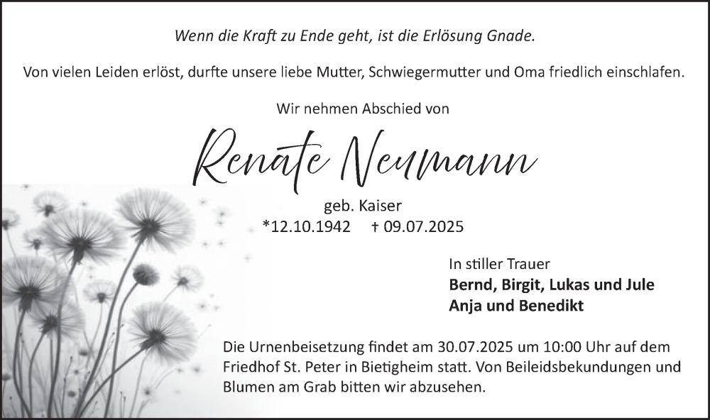 Hier finden Sie alle Traueranzeigen aus der Zeitung, die bisher für Renate Neumann erschienen sind. Weitere Traueranzeigen, die in der Zeitung erscheinen, werden hier ebenfalls aufgelistet