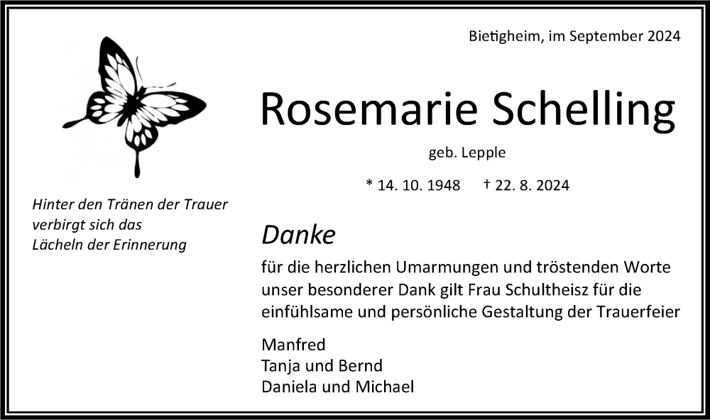 Hier finden Sie alle Traueranzeigen aus der Zeitung, die bisher für Rosemarie Schelling erschienen sind. Weitere Traueranzeigen, die in der Zeitung erscheinen, werden hier ebenfalls aufgelistet