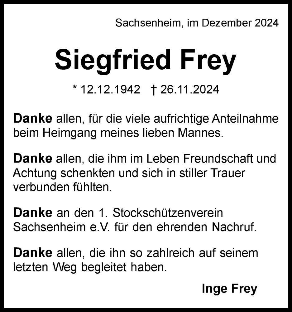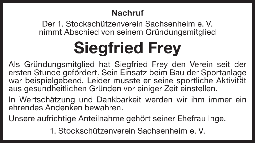 Hier finden Sie alle Traueranzeigen aus der Zeitung, die bisher für Siegfried Frey erschienen sind. Weitere Traueranzeigen, die in der Zeitung erscheinen, werden hier ebenfalls aufgelistet
