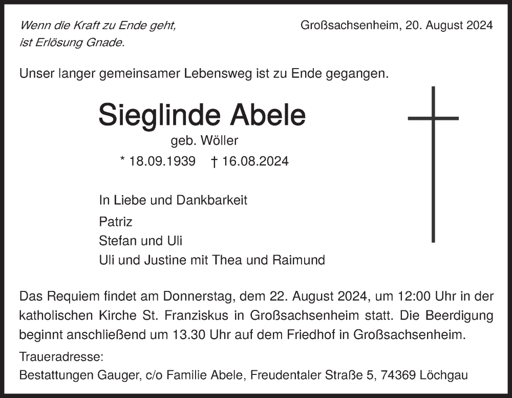 Hier finden Sie alle Traueranzeigen aus der Zeitung, die bisher für Sieglinde Abele erschienen sind. Weitere Traueranzeigen, die in der Zeitung erscheinen, werden hier ebenfalls aufgelistet