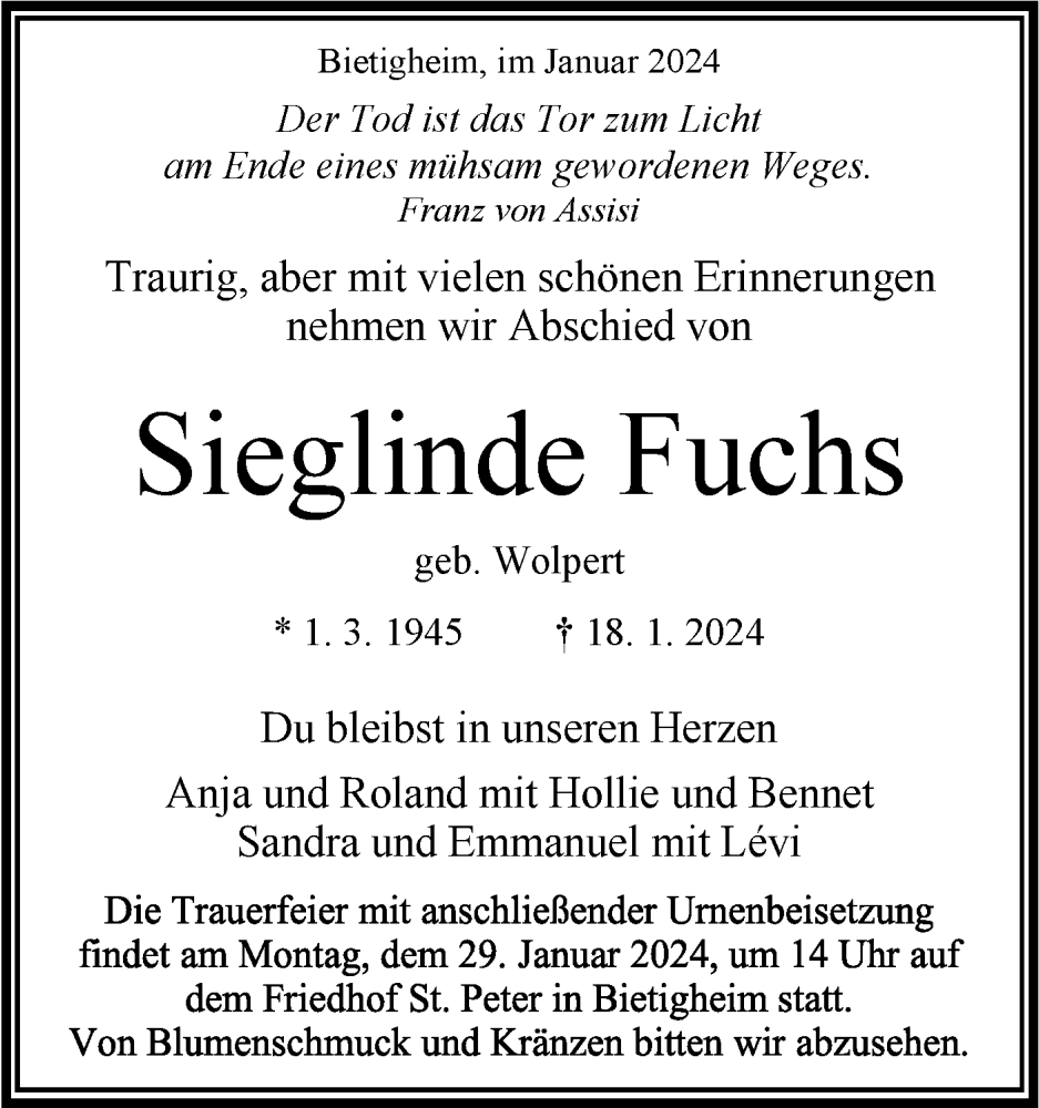 Hier finden Sie alle Traueranzeigen aus der Zeitung, die bisher für Sieglinde Fuchs erschienen sind. Weitere Traueranzeigen, die in der Zeitung erscheinen, werden hier ebenfalls aufgelistet