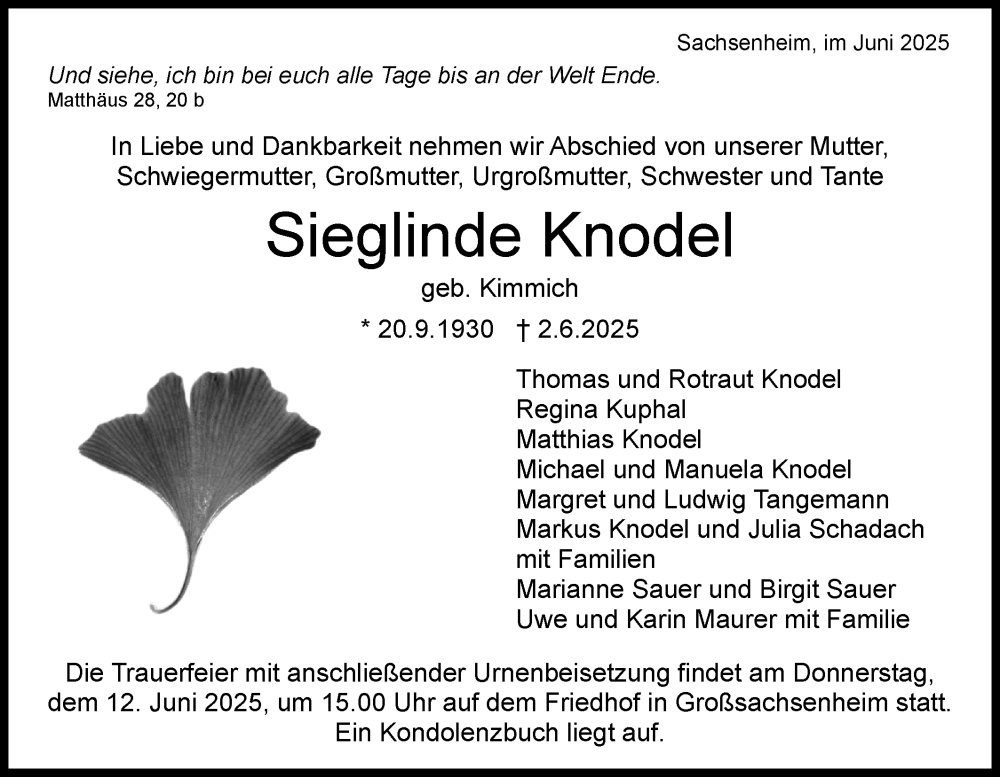 Hier finden Sie alle Traueranzeigen aus der Zeitung, die bisher für Sieglinde Knodel erschienen sind. Weitere Traueranzeigen, die in der Zeitung erscheinen, werden hier ebenfalls aufgelistet