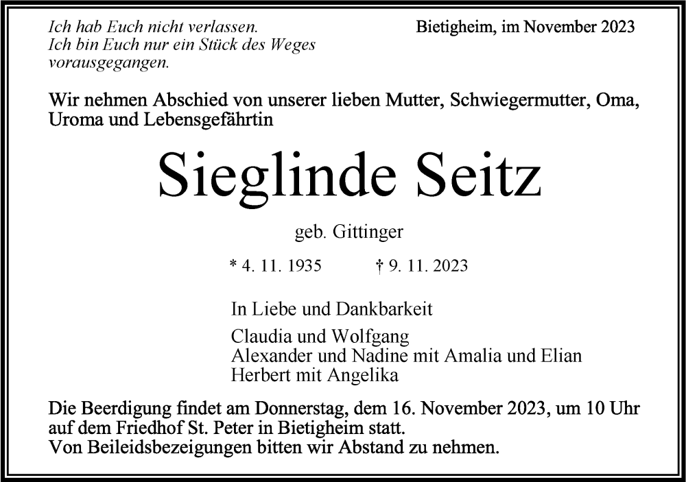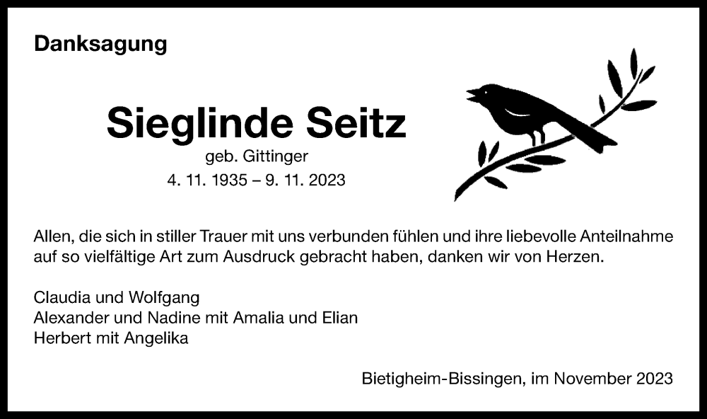 Hier finden Sie alle Traueranzeigen aus der Zeitung, die bisher für Sieglinde Seitz erschienen sind. Weitere Traueranzeigen, die in der Zeitung erscheinen, werden hier ebenfalls aufgelistet