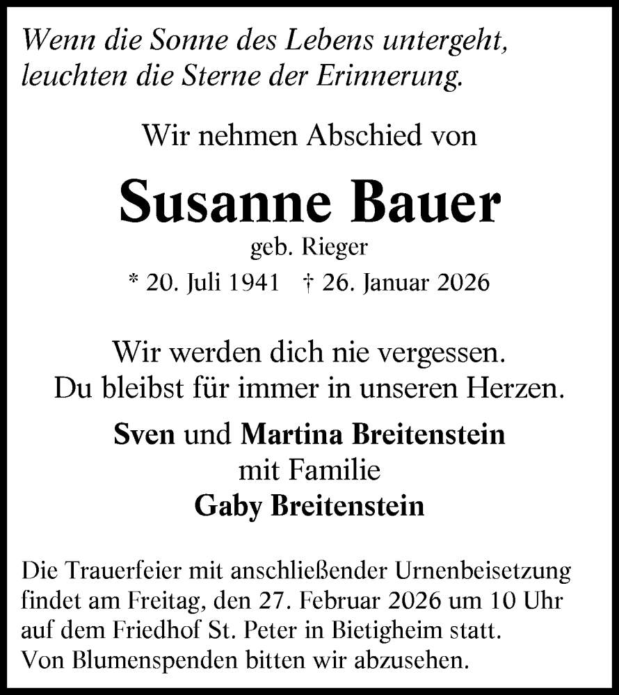 Hier finden Sie alle Traueranzeigen aus der Zeitung, die bisher für Susanne Bauer erschienen sind. Weitere Traueranzeigen, die in der Zeitung erscheinen, werden hier ebenfalls aufgelistet