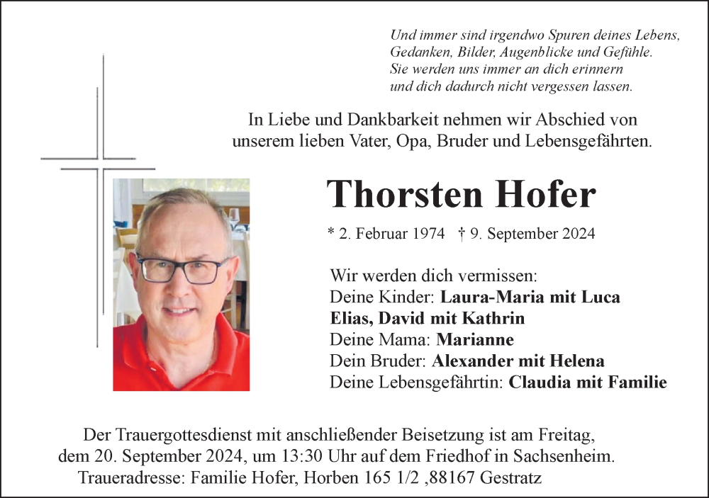 Hier finden Sie alle Traueranzeigen aus der Zeitung, die bisher für Thorsten Hofer erschienen sind. Weitere Traueranzeigen, die in der Zeitung erscheinen, werden hier ebenfalls aufgelistet
