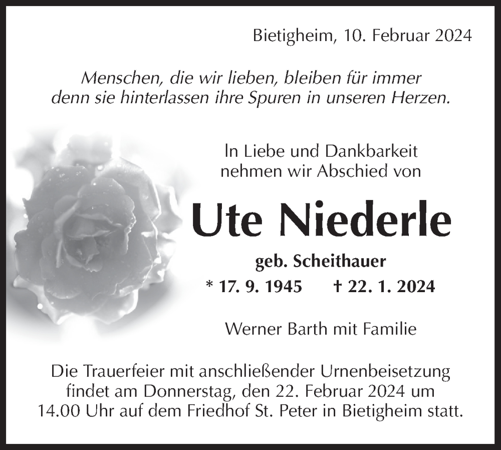 Hier finden Sie alle Traueranzeigen aus der Zeitung, die bisher für Ute Niederle erschienen sind. Weitere Traueranzeigen, die in der Zeitung erscheinen, werden hier ebenfalls aufgelistet