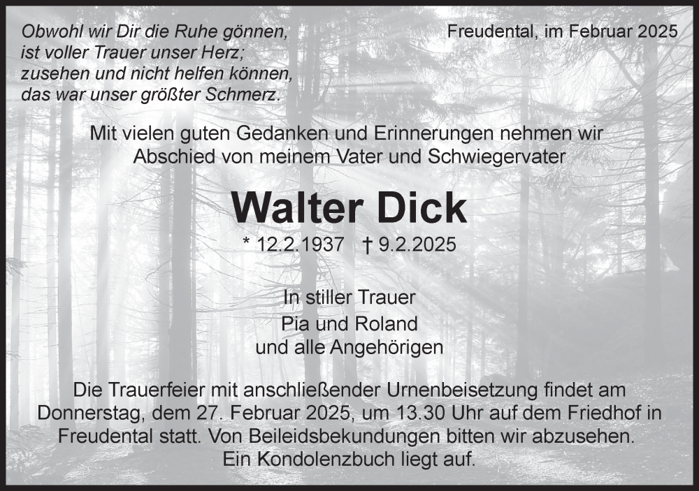 Hier finden Sie alle Traueranzeigen aus der Zeitung, die bisher für Walter Dick erschienen sind. Weitere Traueranzeigen, die in der Zeitung erscheinen, werden hier ebenfalls aufgelistet