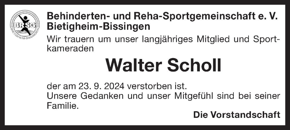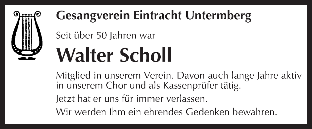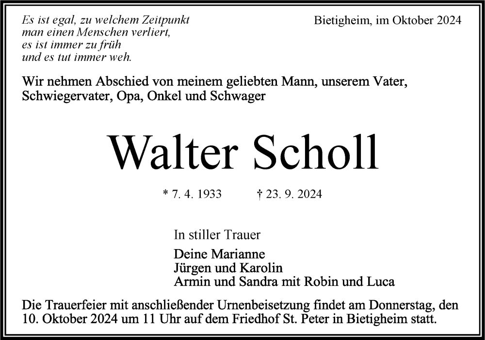 Hier finden Sie alle Traueranzeigen aus der Zeitung, die bisher für Walter Scholl erschienen sind. Weitere Traueranzeigen, die in der Zeitung erscheinen, werden hier ebenfalls aufgelistet