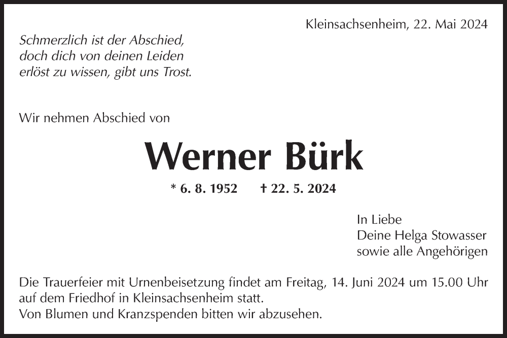 Hier finden Sie alle Traueranzeigen aus der Zeitung, die bisher für Werner Bürk erschienen sind. Weitere Traueranzeigen, die in der Zeitung erscheinen, werden hier ebenfalls aufgelistet