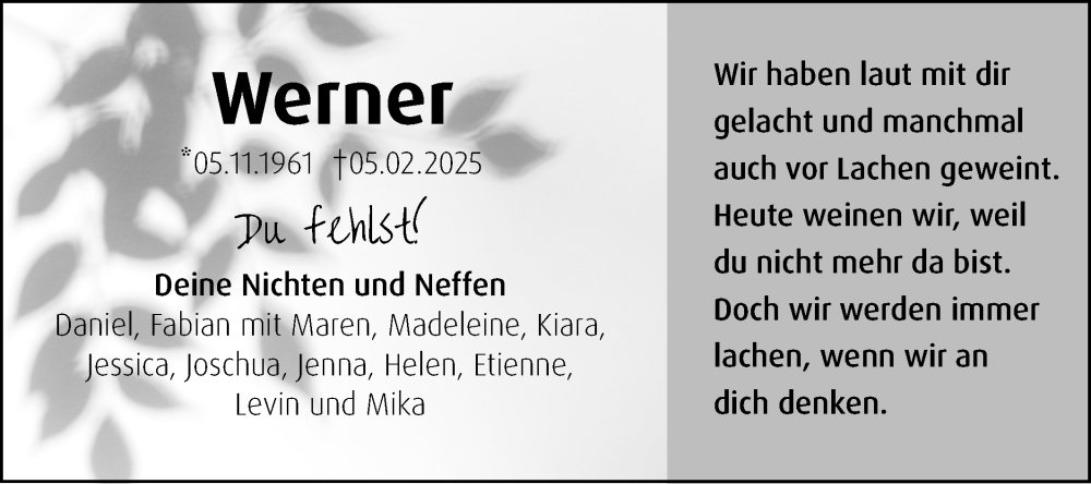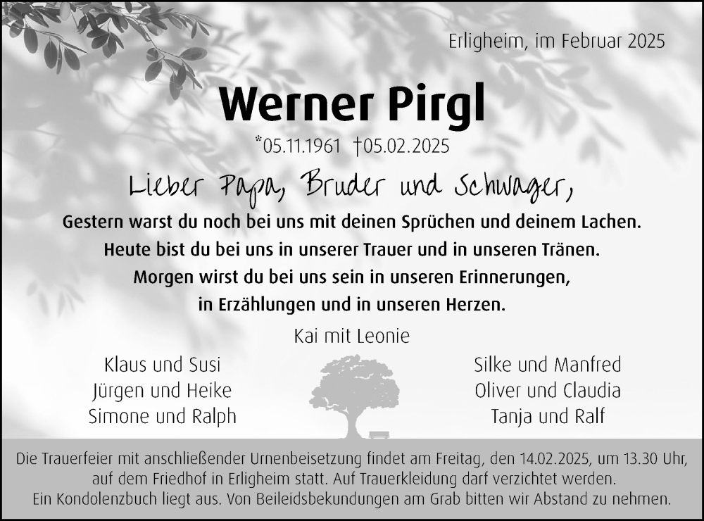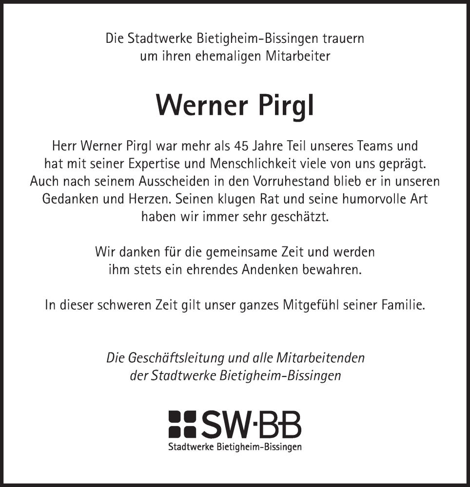 Hier finden Sie alle Traueranzeigen aus der Zeitung, die bisher für Werner Pirgl erschienen sind. Weitere Traueranzeigen, die in der Zeitung erscheinen, werden hier ebenfalls aufgelistet