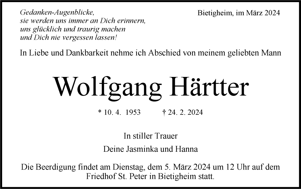 Hier finden Sie alle Traueranzeigen aus der Zeitung, die bisher für Wolfgang Härtter erschienen sind. Weitere Traueranzeigen, die in der Zeitung erscheinen, werden hier ebenfalls aufgelistet