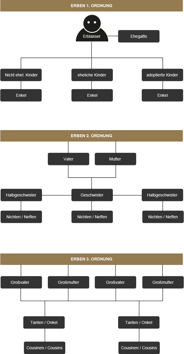• Gibt es auch keine Erben auf der zweiten Ebene, folgen die gesetzlichen Erben der dritten Ordnung. Dazu gehören Ihre Großeltern und deren Nachkommen. Sind Ihre Großeltern bereits verstorben, sind Ihre noch lebenden Tanten und Onkel erbberechtigt.